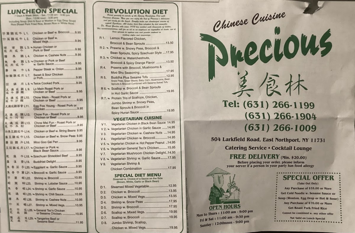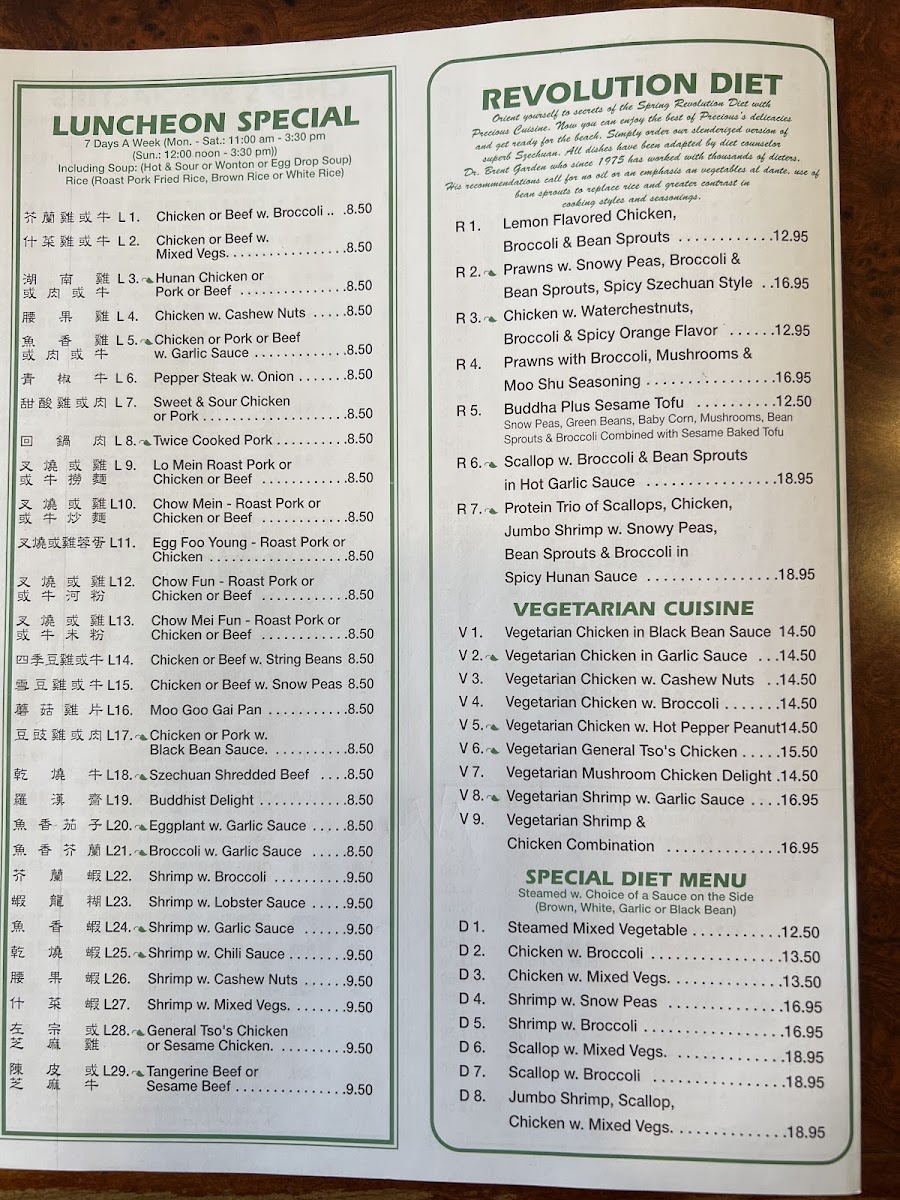 Overall, Precious Chinese Cuisine offers an extensive and well-rounded menu, ensuring that there is something delicious for every palate, whether you're in the mood for something spicy, savory, or light.